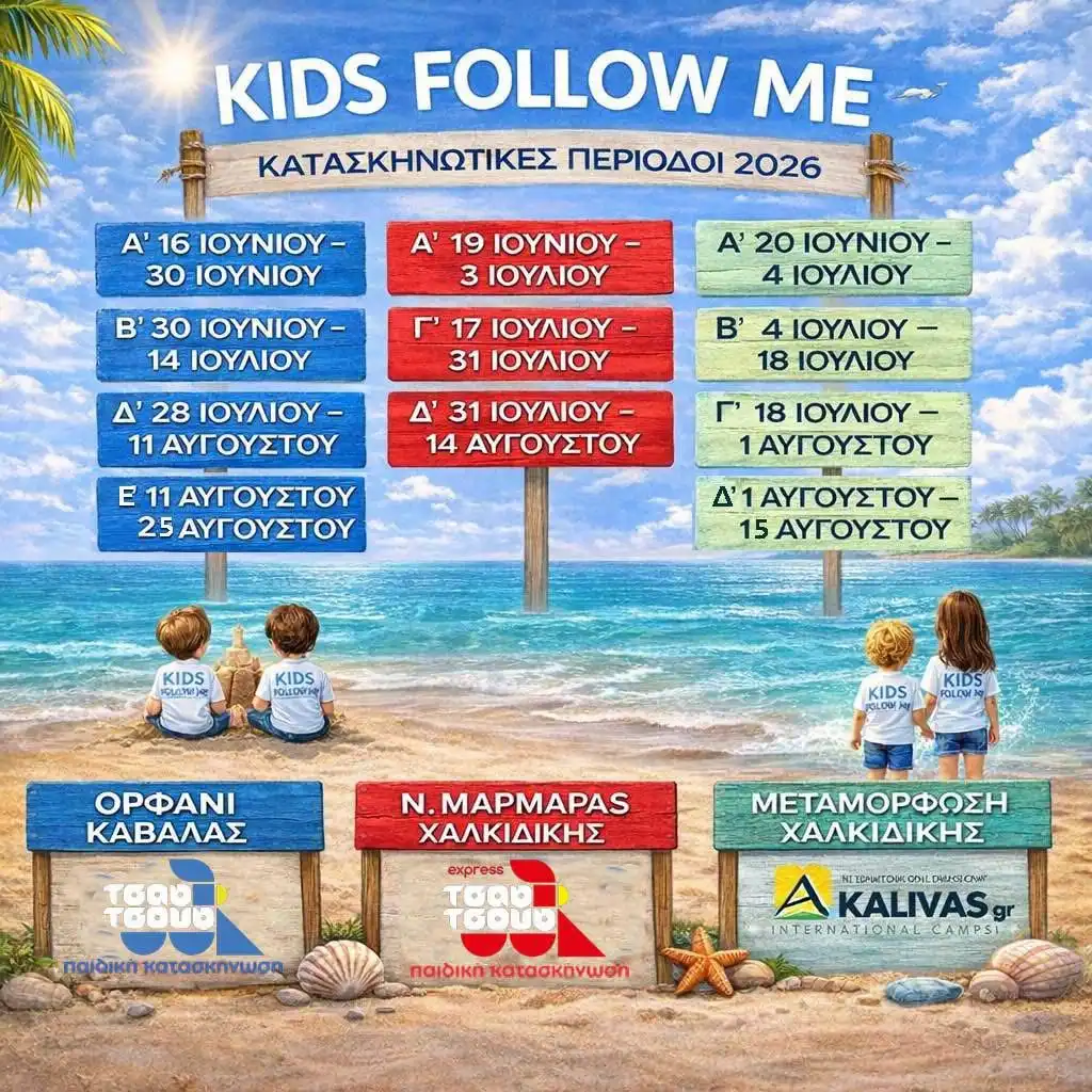 Καλό μήνα σε όλους! Ώρα για περιπέτεια, χαμόγελα και… καλοκαίρι στην κατασκήνωση! Έφτασε η στιγμή! Ξεκινάμε τις κρατήσεις θέσεων για την κατασκήνωση της επιλογής σας για το 2026! Επιλέξτε την κατασκήνωση που σας ταιριάζει: 1. ΚΑΛΥΒΑΣ – Μεταμόρφωση Χαλκιδικής 2. ΤΣΑΦ ΤΣΟΥΦ – Ορφάνι Καβάλας 3. ΤΣΑΦ ΤΣΟΥΦ EXPRESS – Μαρμαράς Χαλκιδικής Οι κρατήσεις γίνονται εύκολα και γρήγορα ηλεκτρονικά: www.kidsfollowme.gr Μετά την κράτηση, θα σας ενημερώνουμε άμεσα και υπεύθυνα για τη διαδικασία εγγραφής στον ασφαλιστικό φορέα. Μην ξεχάσετε να δηλώσετε τους φίλους σας με τους οποίους θα συγκατοικήσετε! Δείτε παρακάτω τις διαθέσιμες περιόδους και ξεκινήστε την περιπέτεια!